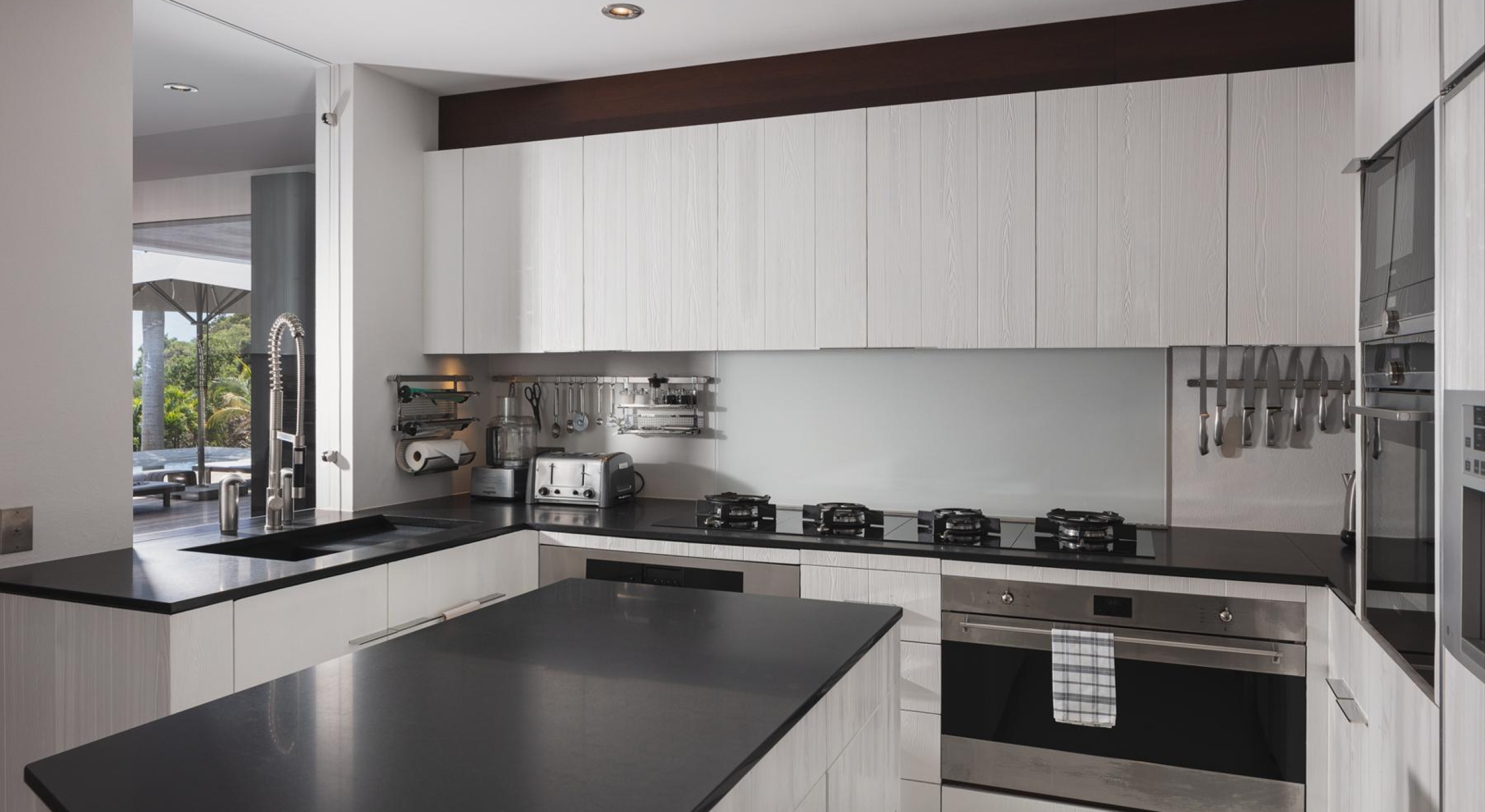 On the pool level, you will find the master bedroom overlooking the sea, a large living opened onto a spacious deck, a dining room opened on both side of the garden and the terrace with the view. There are two kitchens, one opened onto the living and terrace and the other one with the air-conditioning, perfect for a chef.